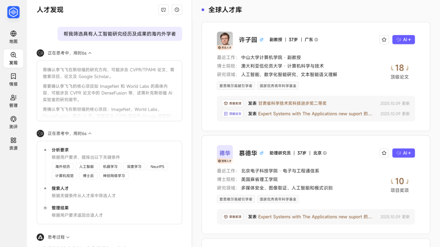 依托AI原生架构,人才已成为焦点计谋资本。持续抓取、跟进人才的科研、任职变更、项目荣誉等最新动态,为引才供给了科学的决策支持,